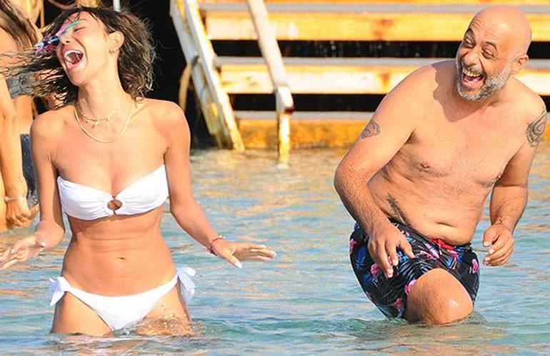 Tatilde neşesinin bir hayli yerinde olduğu gözlenen Didem Kınalı, Ege'nin serin sularında arkadaşı Peker Halil'e mini bir gösteri sundu.