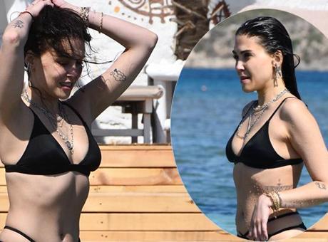 Kusursuz fiziği ile dikkat çeken Aksüyek, arkadaşı ile denizde sohbet ederek zaman geçirdi. Duş aldıktan sonra locasına dönen Aksüyek, güneşlenmeye devam etti.