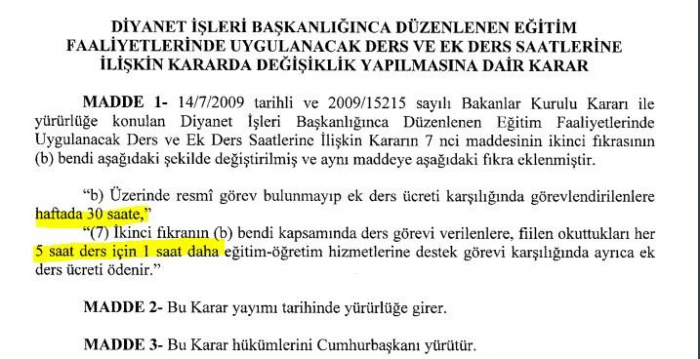 Böylece, Diyanet görevlilerinin 25 saat üst sınırı hesapta 36 saate kadar çıkmış oldu. Böylece Diyanet’te ders verenlerin ücreti yüzde 44 oranında zamlandı.