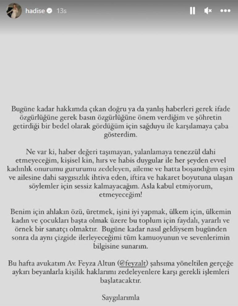 Hakkındaki söylemler için 'iftira' diyen, hatta yorumların hakaret boyutuna ulaştığını belirten Hadise, söz konusu paylaşımında şu ifadelere yer verdi: