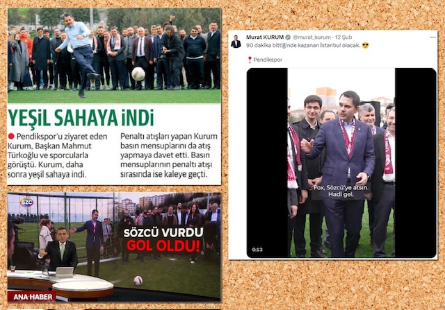 Murat Kurum, topu alıp gazetecilere dönüyor, “FOX, Sözcü’ye atsın. Hadi gel” diyor. FOX TV muhabirinin “Ben kalecilikte iyi değilim” demesi üzerine Murat Kurum ve FOX muhabiri kaleye geçiyor; Sözcü muhabiri de kaleye şut çekiyordu. Kahkahalar, espriler arasında Murat Kurum da Pendikspor kalecisine gol atıyordu.