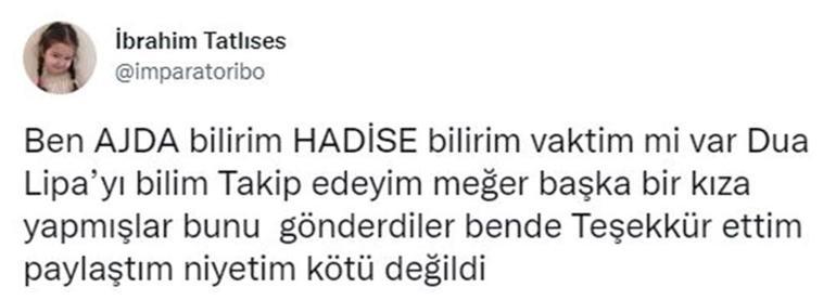 "Ben Ajda Pekkan bilirim, Hadise bilirim" diyen Tatlıses, "Vaktim mi var da Dua Lipa’yı bileyim, takip edeyim? Meğer başka bir kıza yapmışlar, bunu gönderdiler. Ben de teşekkür ettim, paylaştım. Niyetim kötü değildi" şeklinde konuştu.