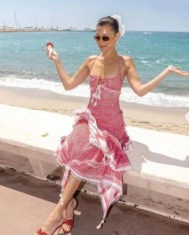 Cannes'da boy gösteren Bella Hadid, elbisesiyle gündem olmuştu. Filistinli Müslüman bir aileden Mohamed Anwar Hadid'in kızı olan ünlü model, Cannes sokaklarında ülkesine desteğini belirten kefiye elbisesiyle gezmişti.