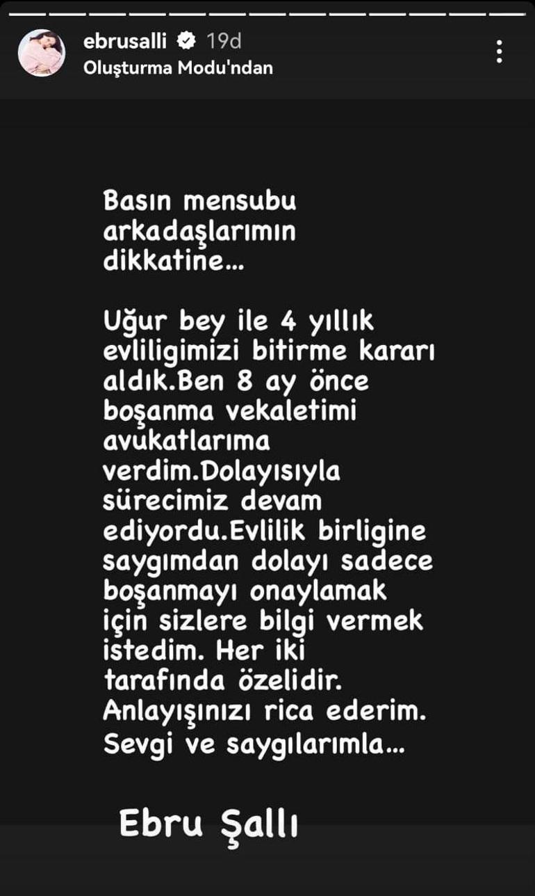 Uğur Bey ile 4 yıllık evliliğimizi bitirme kararı aldık. Ben 8 ay önce boşanma vekaletimi avukatlarıma verdim. Dolayısıyla sürecimiz devam ediyordu. Evlilik birliğine saygımdan dolayı sadece boşanmayı onaylamak için sizlere bilgi vermek istedim. Her iki tarafın da özelidir. Anlayışınızı rica ederim. Sevgi ve saygılarımla...''