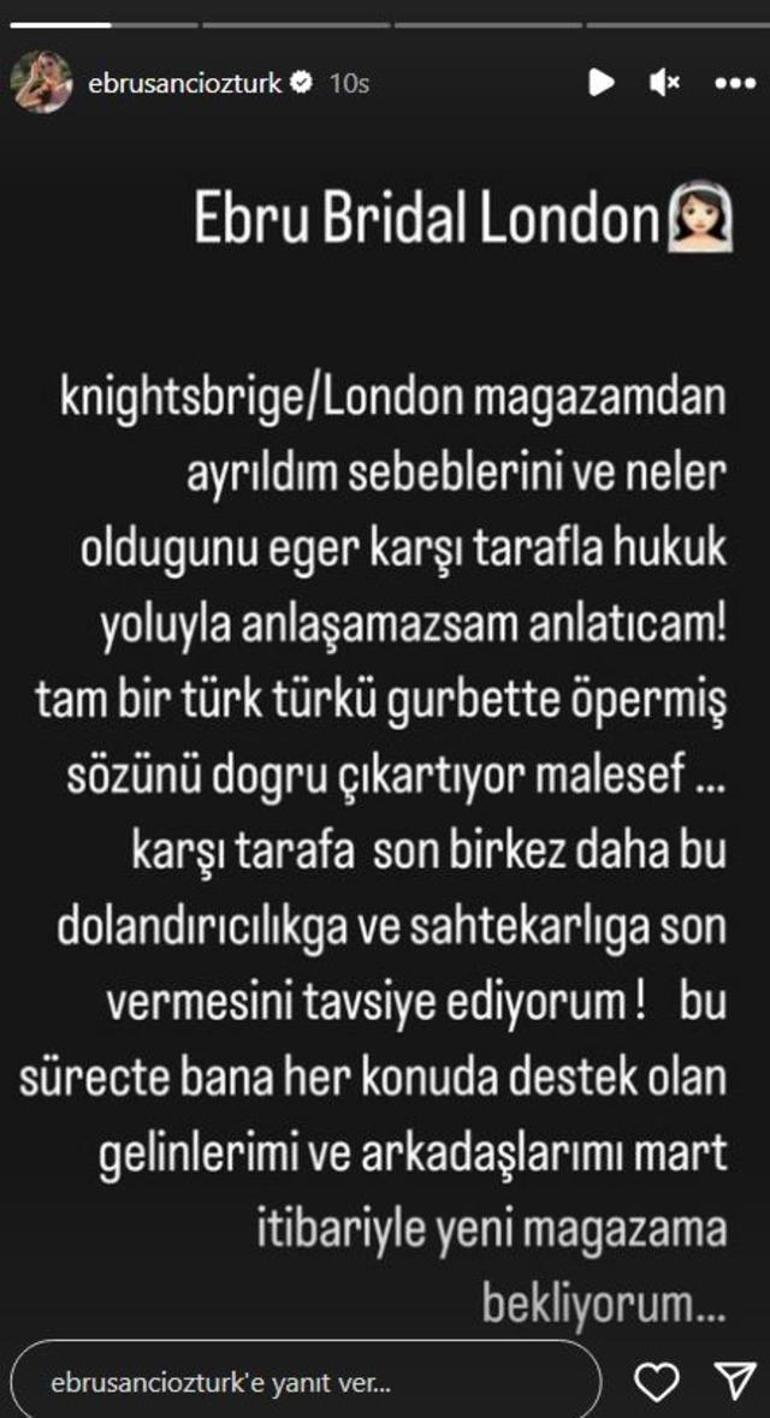 Ortağıyla sorunlar yaşayan Ebru Şancı, Instagram hesabından yaptığı paylaşımda "Londra mağazamdan ayrılma sebeplerini ve neler olduğunu eğer karşı tarafla hukuk yoluyla anlaşamazsam anlatacağım. Tam bir Türk, Türk'ü gurbette öpermiş sözünü doğru çıkartıyor maalesef. Karşı tarafa son bir kez daha dolandırıcılığa ve sahtekarlığa son vermesini tavsiye ediyorum. Bu süreçte bana her konuda destek olan gelinlerimi ve arkadaşlarımı mart itibariyle yeni mağazama bekliyorum" dedi.