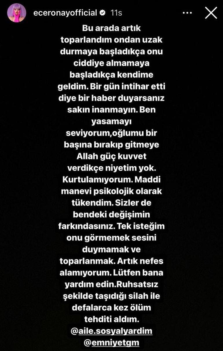 Şiddete maruz kaldığı anları yine sosyal medya hesabından yayınlayan Ece Ronay, "Tek isteğim onu görmemek, sesini duymamamk ve toparlanmak. Artık nefes alamıyorum. Lütfen bana yardım edin. Ruhsatsız şekilde taşıdığı silah ile defalarca kez ölüm tehdidi aldım" ifadelerini kullandı.