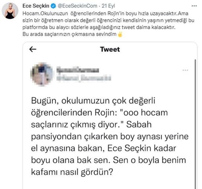 Ece Seçkin, geçtiğimiz günlerde Twitter’da boyu ile ilgili bir tweet atan öğretmene cevap vermiş, bu tepki haberlere konu olmuştu. Ünlü şarkıcı,konuyla ilgili şu açıklamayı yaptı: