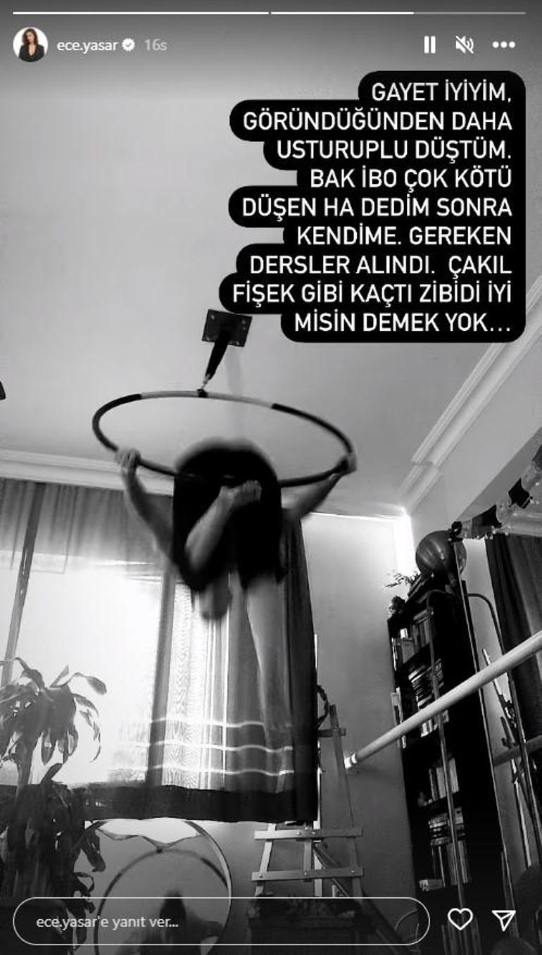Oyunculuğun yanı sıra dansa merakı olan Ece Yaşar, evinde tavana asılı olan çemberin içinde dans ediyor. Zaman zaman Instagram hesabından dans videolarını yayınlayan oyuncu, son olarak çemberin içinden düştüğü anı paylaştı.