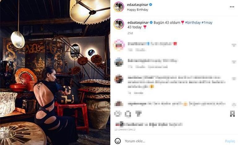 43'üncü yaşını kutlayan Eda Taşpınar, derin sırt dekolteli elbisesiyle çekilen karesini, 585 bin takipçisinin bulunduğu Instagram sayfasından ''Bugün 43 oldum'' notuyla yayınladı. Taşpınar'ın takipçileri paylaşımını beğeni yağmuruna tutarken, doğum günü mesajları yağdırdı.