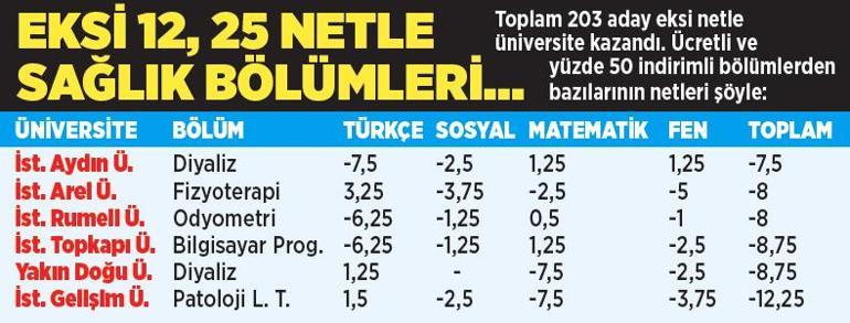 kendi alanlarında dahi eksi net yaptı. Örneğin İstanbul Topkapı Üniversitesi’nde (%50 indirimli) tarih bölümü kazanan bir aday, Temel Yeterlilik Testi’nin (TYT) sosyal bölümünde eksi 0,75, Alan Yeterlilik Testleri’nin (AYT) tarih bölümünde ise eksi 1 net yaptı.