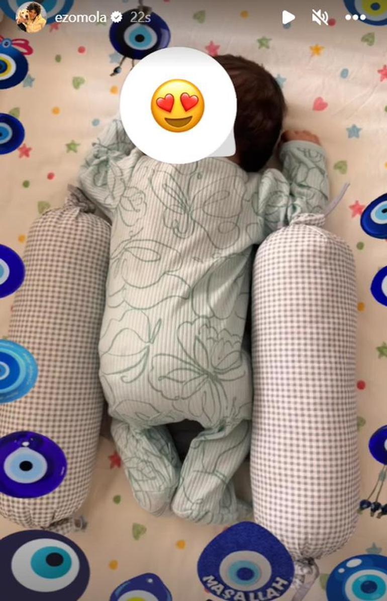 Mola, bebeğinin yatağında çektiği kareye Doğuş'un 'Bunun Adına Yürek Derler' şarkısını ve nazar boncuğu emojileri de ekledi.