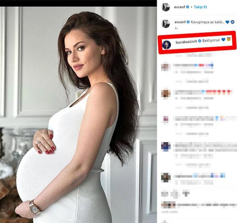 Fahriye Evcen, sosyal medyada yayınladığı karnı burnunda iki kareye, nazar boncuğu ve mavi kalp emojisiyle birlikte "Kavuşmaya az kaldı" mesajını yazdı. Eşinin gönderisine kayıtsız kalmayan Burak Özçivit, "Bekliyoruz" yorumuna bebek emojisi de ekledi.