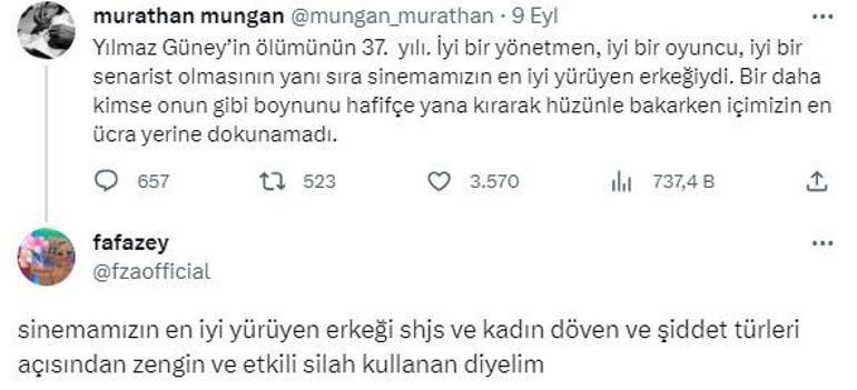 Yazar Murathan Mungan, 9 Eylül 1984'te vefat eden Yılmaz Güney'in ölüm yıl dönümü vesilesiyle sosyal medyada "Yılmaz Güney'in ölümünün 37'nci yılı. İyi bir yönetmen, iyi bir oyuncu, iyi bir senarist olmasının yanı sıra sinemamızın en iyi yürüyen erkeğiydi. Bir daha kimse onun gibi boynunu hafifçe yana kırarak hüzünle bakarken içimizin en ücra yerine dokunamadı" ifadelerini kullandı.