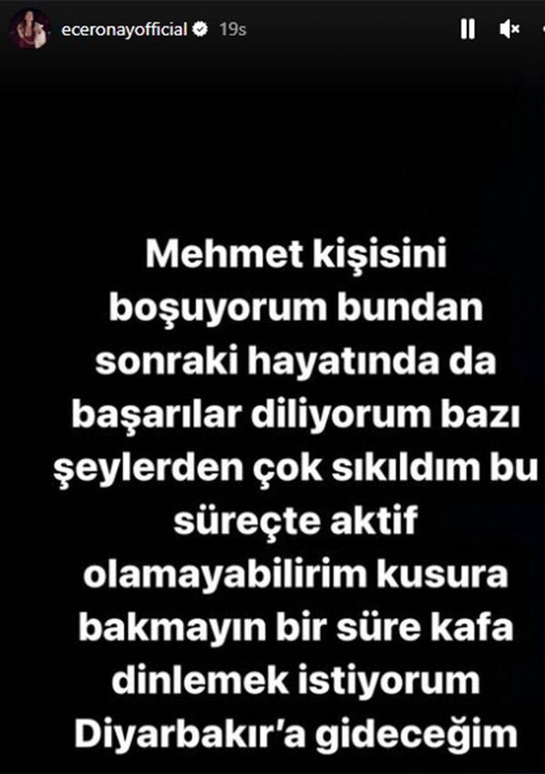 Sosyal medya hesabından açıklama yayınlayan Ronay, "Mehmet kişisini boşuyorum. Bundan sonraki hayatında da başarılar diliyorum. Bazı şeylerden çok sıkıldım. Bu süreçte aktif olmayabilirim kusura bakmayın. Bir süre kafa dinlemek istiyorum, Diyarbakır'a gideceğim" ifadelerini kullandı.