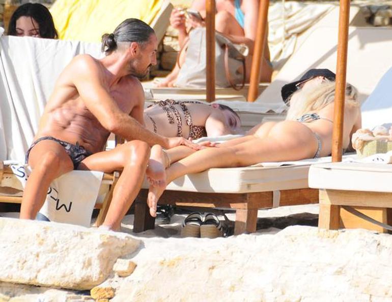 Kaslı vücuduyla dikkat çeken Aykut Erçetin, denize girmeyen eşine güneş kremiyle masaj yaptı. Eva Erçetin'in mankenleri kıskandıracak fit hali dikkat çekti.