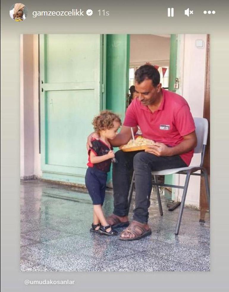 Özçelik de sivillere yemek dağıtan derneğin fotoğraflarını kendi Instagram sayfasından paylaşarak; "Sıcak yemek dağıtımlarımızdan bu fotoğrafa kalbimi bıraktım. Allah'ım korusun, kollasın..." mesajını yazdı.