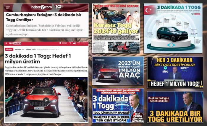 Erdoğan’ın “3 dakikada bir TOGG” sözleri iktidar medyasında başlıklarda kullanıldı; haberlerde sık tekrarlandı. Fakat fabrikayı gezen gazeteciler bile bu “efsaneyi” araştırmadılar.