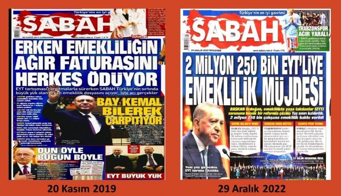 Erdoğan’ın 17 Kasım 2019’da yayımlanan EYT karşıtı bu açıklamalarına en büyük destek de Turkuvaz Grubu’ndan gelmiş; Sabah üç gün sonra da “Erken emekliliğin ağır faturasını herkes ödüyor” manşetiyle çıkmıştı. Dilek Güngör’ün hazırladığı sayfada EYT’nin sakıncaları anlatılmış; “muhalefetin oy uğruna EYT’lilere destek verdiği” savunulmuştu. Sabah yazarları Engin Ardıç, “Koparılan EYT yaygarası”, Melih Altınok, “Cumhurbaşkanının popülizme teslim olmaması takdire şayan”, Mevlüt Tezel de “Gençlerden hiç itiraz gelmiyor, aksine muhalefet olsun diye EYT'lileri destekliyorlar” diyerek desteklemişlerdi Erdoğan’ın EYT karşıtı sözlerini.