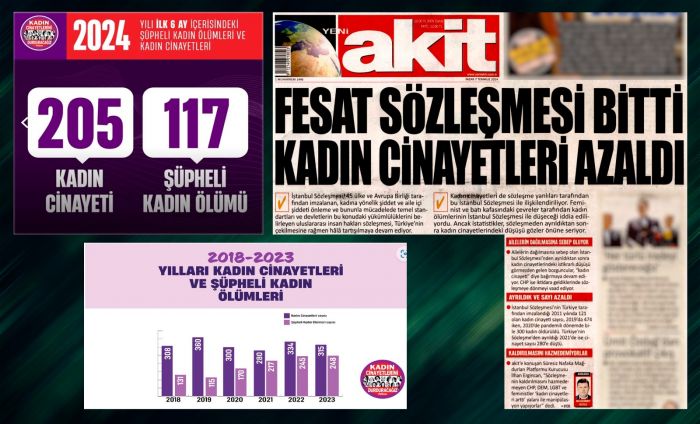 - Yeni Akit, “Fesat sözleşmesi bitti kadın cinayetleri azaldı” manşetinde İstanbul Sözleşmesi’nin feshedildiği 2021 ve sonrasında azaldığını yazdı ama Kadın Cinayetleri Platformu’na