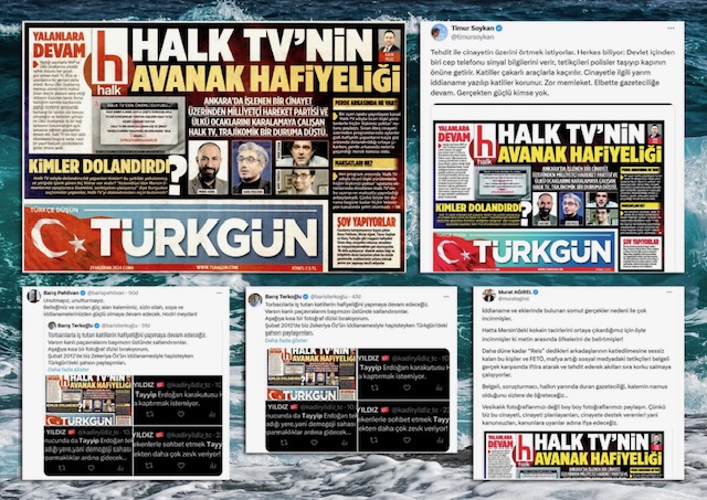 MHP’nin gazetesi Türkgün, “Halk TV’nin avanak hafiyeliği” manşetiyle gazeteciler Timur Soykan, Barış Pehlivan, Barış Terkoğlu ve Murat Ağırel’in Halk TV’deki yayınlarda belgeler ortaya koyarak Sinan Ateş cinayetini aydınlatmaya çalışmasından rahatsızlığını dışa vurdu.