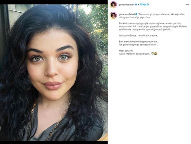Uzun süredir ekranlardan uzak olan oyuncu Gonca Vuslateri, sosyal medya hesabından yaptığı paylaşımla bazı meslektaşlarını kızdıracak açıklamalarda bulunmuştu. Yüzüne estetikli bir filtre uyguladığı fotoğrafını yayınlayan 35 yaşındaki oyuncu, isim vermeden bazı kadın meslektaşlarını hedef aldı.35 yaşındaki Vuslateri, gönderisine, şu notu düşmüştü: