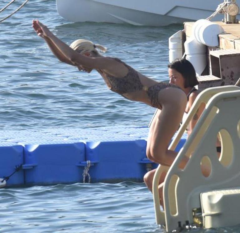Arslan, daha sonra suyun soğukluğunu kontrol edip estetik bir atlayışla kendini Bodrum'un serin sularına bıraktı. Denizde kısa süre yüzen güzel oyuncu, daha sonra iskeleden çıkarak şezlonguna doğru gitti.
