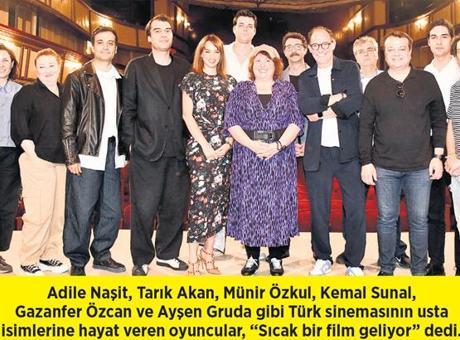 Yönetmen koltuğunda Çağan Irmak’ın oturduğu BKM imzalı projede usta oyuncu Naşit’e hayat veren Meltem Kaptan, “Onu hissetmeye çalıştım. O meşhur gülüşü için epey kafa yordum. İlk denemede başım döndü, nefes alamadım. İki hafta sonra oturdu o gülüş” dedi. Müjde Ar olarak izleyici karşısına çıkmaya hazırlanan Seda Bakan ise, “Bu filmle Yeşilçam’a ışınlanıyoruz hep beraber. Müjde Hanım’la iyi arkadaş olduk. Hayat tavsiyeleri de alıyorum” diye konuştu. 2009 yılında hayatını kaybeden dedesi Gazanfer Özcan’ı canlandıran Tarık Ündüz, heyecanını “Benim için özel bir deneyimdi. ‘Altından kalkabilir miyim?’ korkusunu yaşadım. Bugün de buraya dedemin ölmeden önce taktığı saat ile geldim” sözleriyle dile getirdi. / SEÇKİN ŞENVARDAR