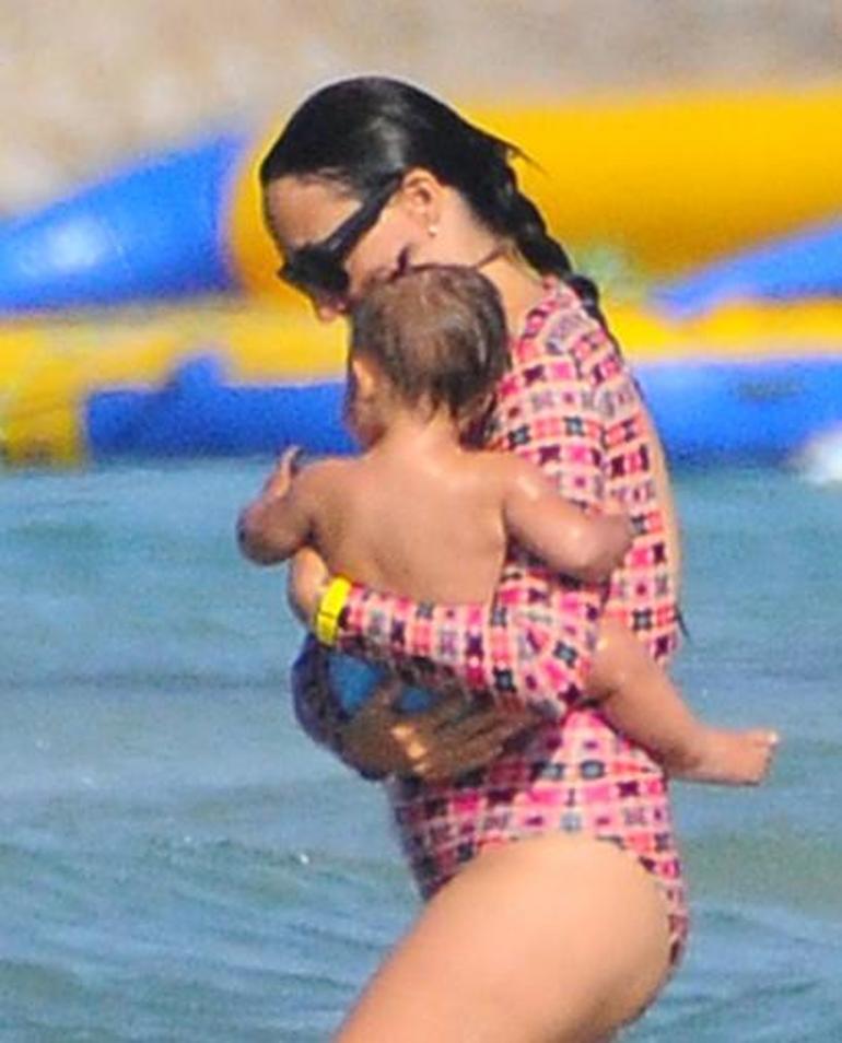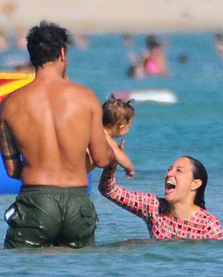Kaslı vücuduyla dikkat çeken baba Arduç, sevimli kızını havalara uçururken, anne Özay da videolarını çekti. Uzun bir süre suyun içinde kalan çift, bebekleriyle eğlenceli dakikalar geçirdi.