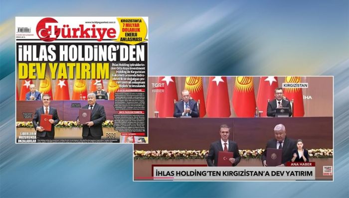 - İhlas Holding’in Kırgızistan’da hidroelektrik ve doğalgaz çevrim santrali ihalesini almasını aynı gruptaki Türkiye gazetesi manşetten, TGRT de aynı görüntüleri defalarca tekrarlayarak 5 dakika boyunca yayımlandı.