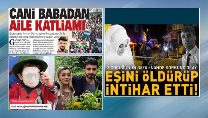 “Bakırköy’de eşini öldürüp intihar etti”, “Üç çocuğunun gözü önünde dehşet saçtı: Eşini öldürüp sonra intihar etti”, “Batman’da oğlu ve eşini tabancayla ateş ederek öldürdükten sonra aynı silahla yaşamına son verdi”, “Göl kıyısında önce sevgilisini öldürdü ardından intihar etti”, “Gaziantep’te aile katliamı! Eşi ve dört çocuğunu öldüren baba intihar etti”.