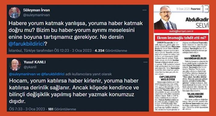 Abdülkadir Selvi’nin “Ekrem İmamoğlu tehdit etti mi” başlıklı yazısı, medyada yaygınlaşan “haberimsi” köşe yazılarına güncel bir örnek. Birincisi haber soru sormaz, sorulara yanıt verir. İkincisi iddianın kaynağı belirsizdi. Üçüncüsü Selvi, İmamoğlu’nun CHP’li bir belediye meclis üyesini tehdit ettiğini öne sürüyordu ama kontrol için ne tarafları aramıştı ne de iddiasını doğrulayan başkaca bir kanıttan söz ediyordu. Sadece “söyleniyor” diyordu. Yazının sonunda “İmamoğlu’nun çıkıp bu doğru değil demesini bekliyorum” diyerek de sorumluluğu kaynağa yüklüyordu. “Haberimsi” yazı yazınca habercilik kuralları tümüyle tersine dönmüştü.