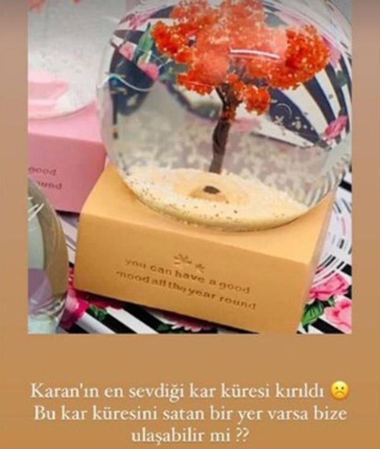 Fahriye Evcen, Instagram hesabı üzerinden 3.5 yaşındaki oğlu Karan'ın kırılan kar küresi oyuncağının aynısından bulup bulamayacaklarını takipçilerine sormuştu: Karan'ın en sevdiği kar küresi kırıldı. Bu kar küresini satan bir şey varsa bana ulaşabilir mi?