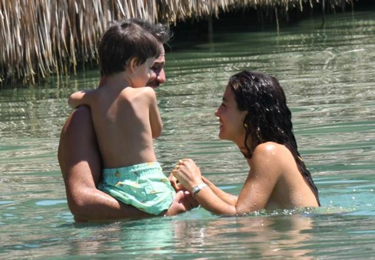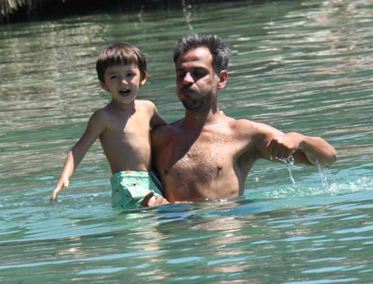 Oldukça keyifli olan baba-oğulun, suyun içindeki eğlenceli halleri görülmeye değerdi. Cansu Tosun da sonra eşine ve oğluna katıldı. Ünlü çift, çocuklarıyla birlikte ailece denize girdi.