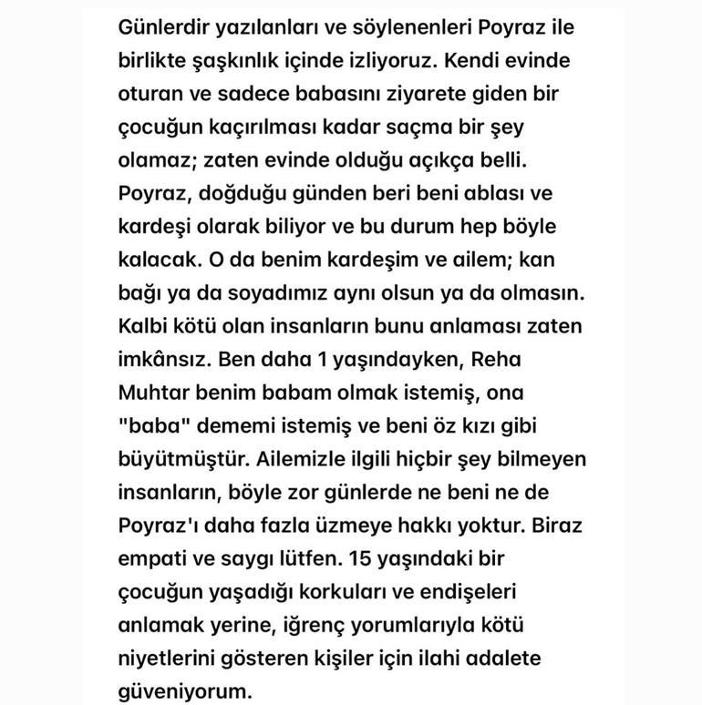 Bunun nedenlerini ben açıklayamam. Benim haddim değil, onların ailevi ilişkileri ben karışamam. Ayşe Nazlı hastanede ağlıyor, çünkü babası yoğun bakımda. Poyraz da onun kardeşi.... Kan bağları olmasa da kardeşi... Bana dedi ki 'Anne, Poyraz eve gitmek istiyor' Çünkü Poyraz'ın kedisi ve köpeği var. Ayşe Nazlı, Poyraz'ı aldı, Reha Bey'in evine gittiler. O sırada bana bir telefon geldi ve 'Ayşe Nazlı, Poyraz'ı hastaneye getirsin yoksa suç duyurusunda bulunacağız' dediler. Ben de aradım kızıma hastaneye dönmelerini söyledim. Ve olayın tamamı budur. Ben dört gündür Bodrum'dayım. Ayşe Nazlı da ablası olarak onun dileğini yerine getirmiştir. Bu iftirayı edenler hakkında bir şey söylemek istemiyorum ve mahkemeye vermek istemiyorum. Çünkü ben bu kötülüklerle uğraşamam. Onlara tek tavsiyem, iyi insan olmaya çalışsınlar. Lütfen iyi insan olmaya çalışın."'