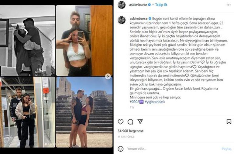 Sevgilisinin yüzüne son kez baktığını söyleyen Aşkım Burçe, "Allah der ki, kimi benden çok seversen onu senden alırım... Ve ekler: 'Onsuz yaşayamam' deme, seni onsuz da yaşatırım... Yarım kalmadık biz. Söz veriyorum mahşere kaldık. Yüzünü görmeye cesaret edemedim önce. Aslında kendimi kandırma şeklimdi bu, 'yüzünü görürsem yaşamadığına inanmak' zorunda kalacaktım artık... Ama son kez bakmalıydım sana, son kez seni çok sevdiğimi söylemeliydim. Bir yerlerden beni izlediğini biliyorum. Kalbim senin evin söz veriyorum, o eve çok iyi bakmaya çalışacağım" mesajını paylaştı.