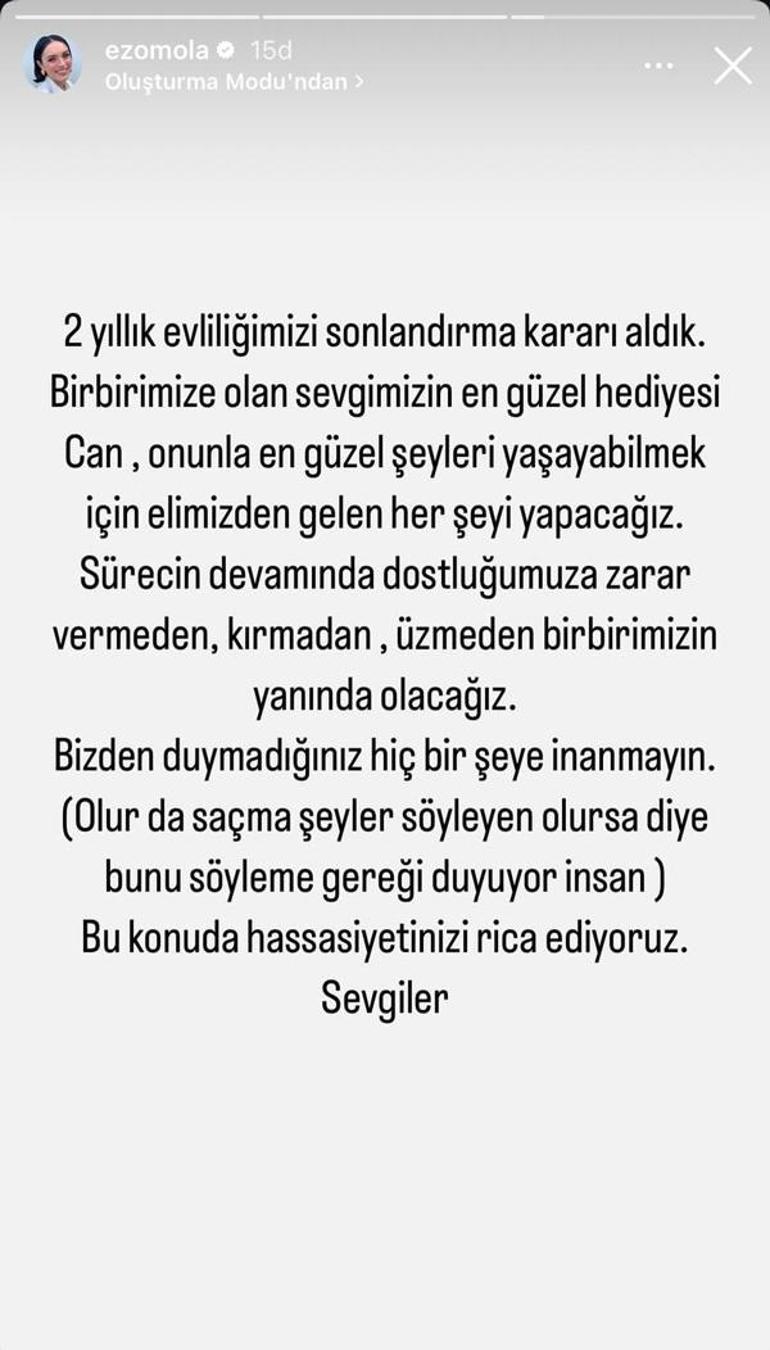 2 yıllık evliliğimizi sonlandırma kararı aldık. Birbirimize olan sevgimizin en güzel hediyesi Can, onunla en güzel şeyleri yaşayabilmek için elimizden gelen her şeyi yapacağız. Sürecin devamında dostluğumuz zarar vermeden, kırmadan, üzmeden birbirimizin yanında olacağız.