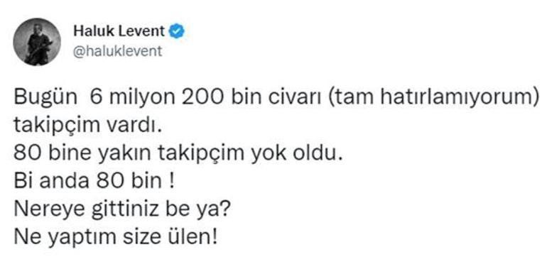 Haluk Levent, Twiter hesabı üzerinden "Bugün 6 milyon 200 bin civarı (tam hatırlamıyorum) takipçim vardı. 80 bine yakın takipçim yok oldu. Bir anda 80 bin! Nereye gittiniz be ya? Ne yaptım size ülen" mesajını yazdı.