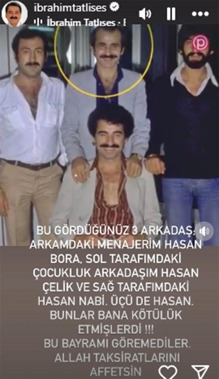 Instagram'da nostaljik bir fotoğrafa yer veren Tatlıses, "Bu gördüğünüz üç arkadaş arkamdaki menajerim Hasan Bora, sol tarafımdaki çocukluk arkadaşım Hasan Çelik ve sağ tarafımdaki Hasan Nabi. Üçü de Hasan, bana kötülük etmişlerdi. Bu bayramı göremediler, Allah taksiratlarını affetsin" ifadelerini kullandı.