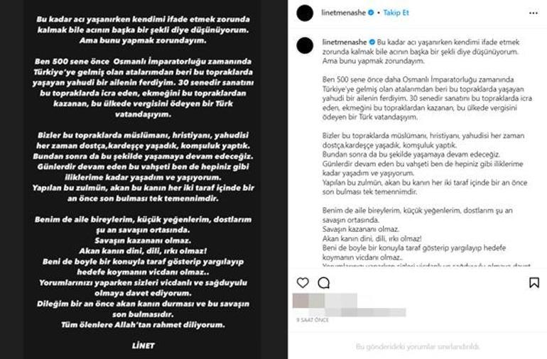 Sanat dünyasının tanınan isimleri İsrail'i ağır bir dille kınarken, 48 yaşındaki İsrail asıllı şarkıcı Linet Mor Menashe'nin 'Hamas katildir' paylaşımı yapıp, Gazze'deki saldırı hakkında ise sessiz kalması tepki çekti.