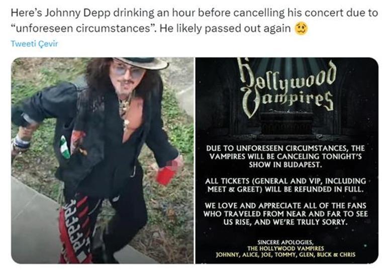 Johnny Depp'in üyesi olduğu müzik grubu Hollywood Vampires, Budapeşte'deki konserlerini aktörün kaldığı otel odasında baygın şekilde bulunması nedeniyle iptal etti.