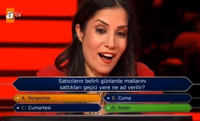 ikinci soru olan, "Satıcıların belirli günlerde mallarını sattıkları geçici yere ne ad verilir?" sorusu soruldu. Şıklarda, 'A- Perşembe', 'B- Cuma', 'C- Cumartesi' ve 'D- Pazar' cevapları vardı.