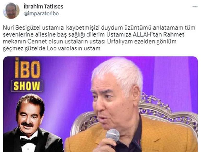 Twitter hesabından sanatçı ile fotoğrafını paylaşan Tatlıses, "Nuri Sesigüzel ustamızı kaybetmişiz. Üzüntümü anlatamam. Tüm sevenlerine, ailesine baş sağlığı dilerim. Ustamıza Allah'tan rahmet, mekanın cennet olsun ustaların ustası. Urfalıyam ezelden gönlüm geçmez güzelden. Var olasın ustam" mesajını yazdı.
