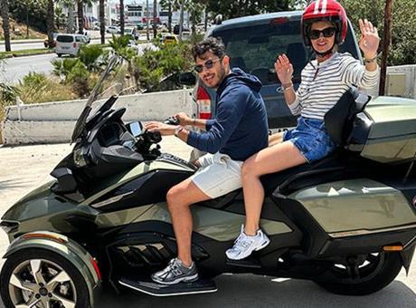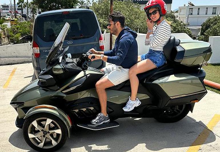 Neşeleri yerinde olan ikili, üç tekerlekli lüks marka motora binerken tedbiri elden bırakmadı. Kasklarını takan Karahan ve eşi Güntay, evlerinin yolunu tuttu.