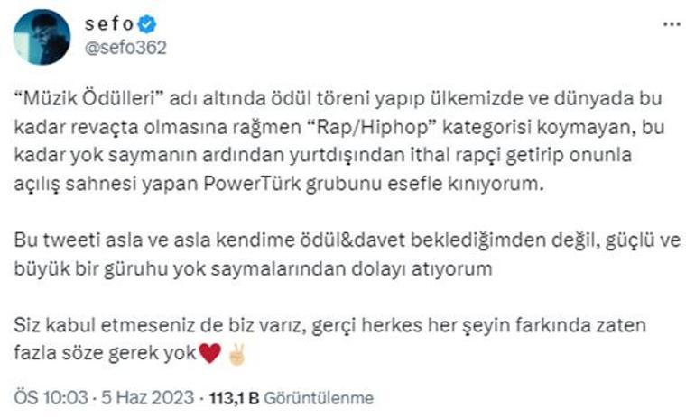 PowerTürk Müzik Ödülleri'nde Rap/Hiphop kategorisine yer verilmediği için Twitter'dan eleştiride bulunan Sefo, "Müzik ödülü veriliyor ama kategori olarak rap ve hip hop'a yer verilmemiş. Bunlar 10 sene önceydi. Bunlar geçti diye düşünüyorum. 10 sene önce rap görmezlikten geliniyordu. Artık var ve herkes farkında. Bu kadar talep edilen bir şeyi görmezden gelmek dinleyiciye saygısızlık" ifadelerini kullandı.