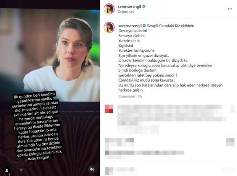 1.8 milyon takipçisi bulunan Instagram sayfasından 'Camdaki Kız'ın finalinden bir kesit yayınlayan Serengil, hikayeler bölümünden yaptığı paylaşıma şu notu yazdı: