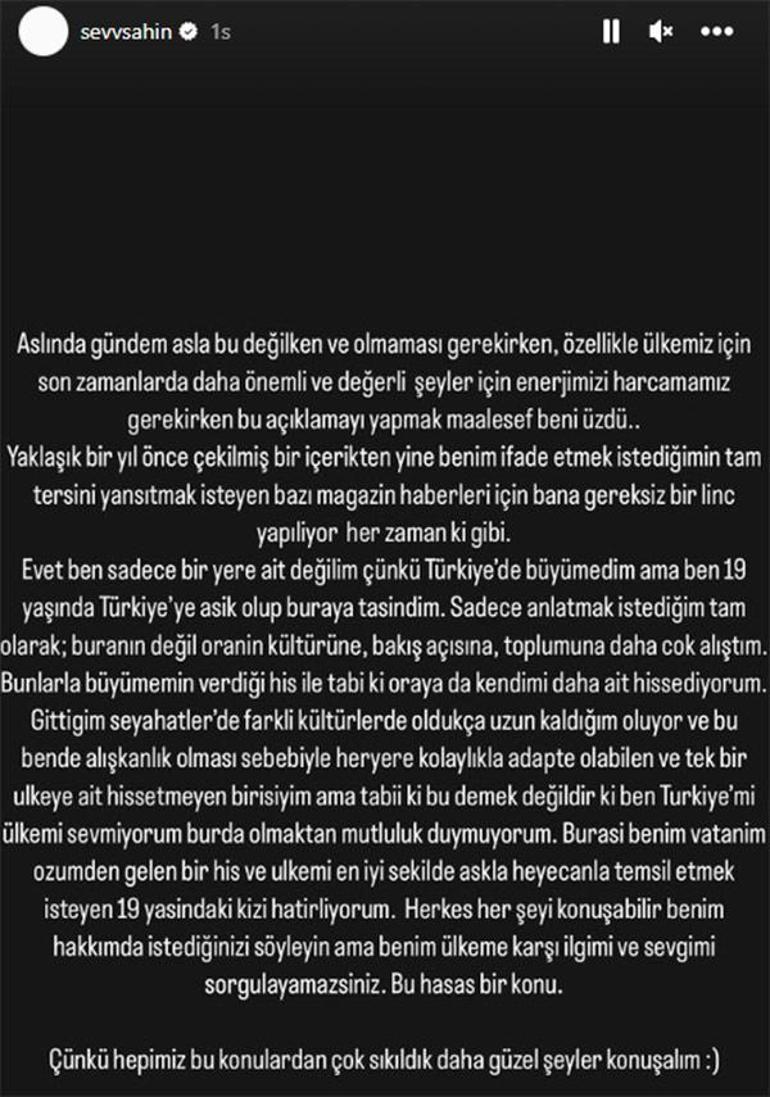 Ünlü isim, Instagram gönderisinde, "Burası benim vatanım. Özümden gelen bir his ve ülkemi en iyi şekilde aşkla, heyecanla temsil etmek isteyen 19 yaşındaki kızı hatırlıyorum. Herkes her şeyi konuşabilir benim hakkımda. İstediğinizi söyleyin ama benim ülkeme karşı ilgimi ve sevgimi sorgulayamazsınız. Bu hassas bir konu. Çünkü hepimiz bu konulardan çok sıkıldık. Daha güzel şeyler konuşalım" sözlerine yer verdi.