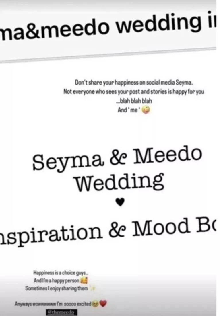Şeyma Subaşı, geçtiğimiz günlerde ise olarak Mısırlı iş insanı sevgilisi Meedo ile evlilik davetiyesini Instagram hesabından takipçilerinin beğenisine sunmuştu. "Mutluluğunu artık sosyal medya hesabından paylaşma Şeyma" diye kendini uyaran sosyal medya fenomeni, "Mutluluk bir seçimdir ve ben bu şekilde çok mutluyum. Çok heyecanlıyım" diyerek evleneceğini duyurmuştu.