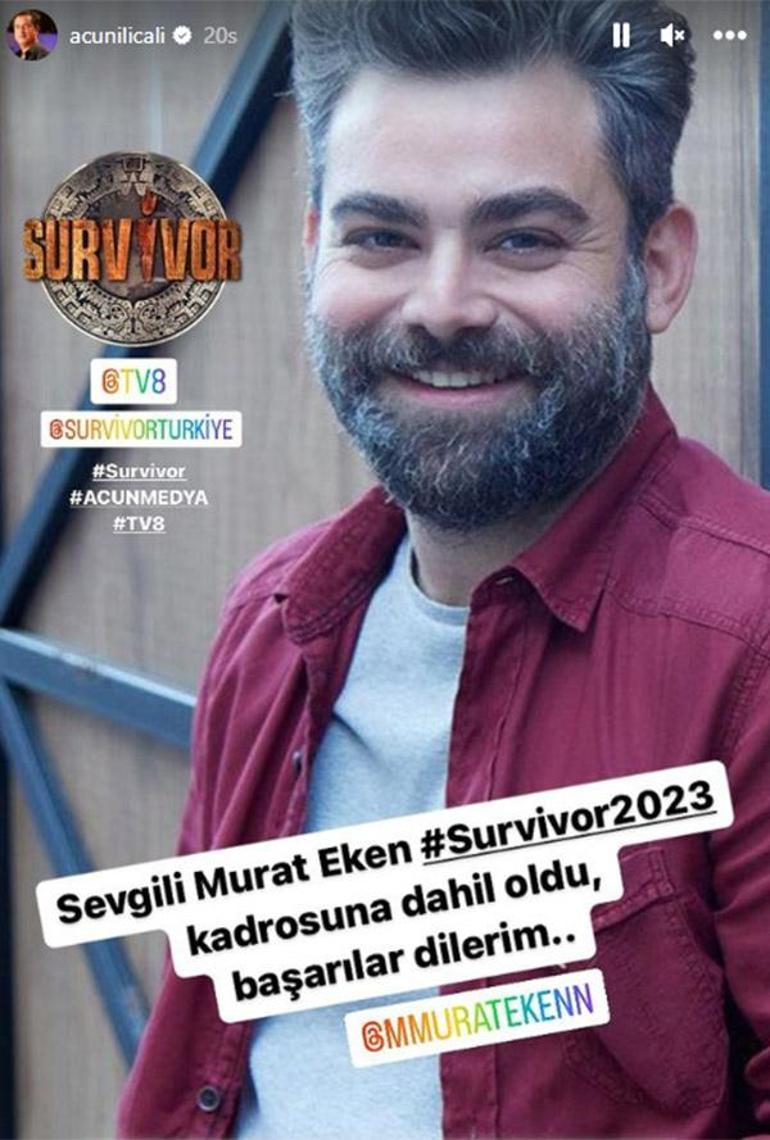 Instagram hesabından dün akşam bir paylaşımda bulunan başarılı televizyoncu, oyuncu Murat Eken'in, Survivor 2023 kadrosunda olduğunu duyurdu. Acun Ilıcalı, "Sevgili Murat Eken Survivor 2023 kadrosuna dahil oldu, başarılar dilerim" mesajını yazdı.
