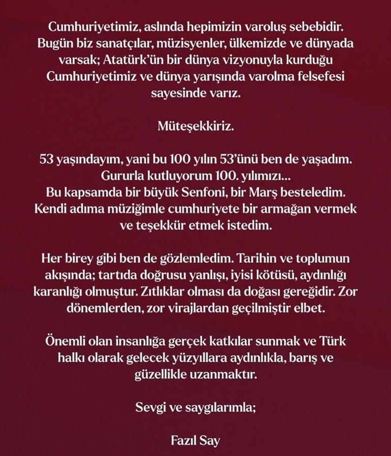 Bu kapsamda bir büyük Senfoni, bir Marş besteledim. *Kendi adıma müziğimle cumhuriyete bir armağan vermek ve teşekkür etmek istedim.