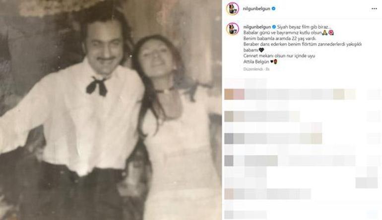"Siyah-beyaz film gibi biraz. Babalar Günü ve bayramınız kutlu olsun. Benim babamla aramda 22 yaş vardı. Beraber dans ederken benim flörtüm zannederlerdi yakışıklı babamı. Cennet, mekânı olsun. Nur içinde uyu Attila Belgün."